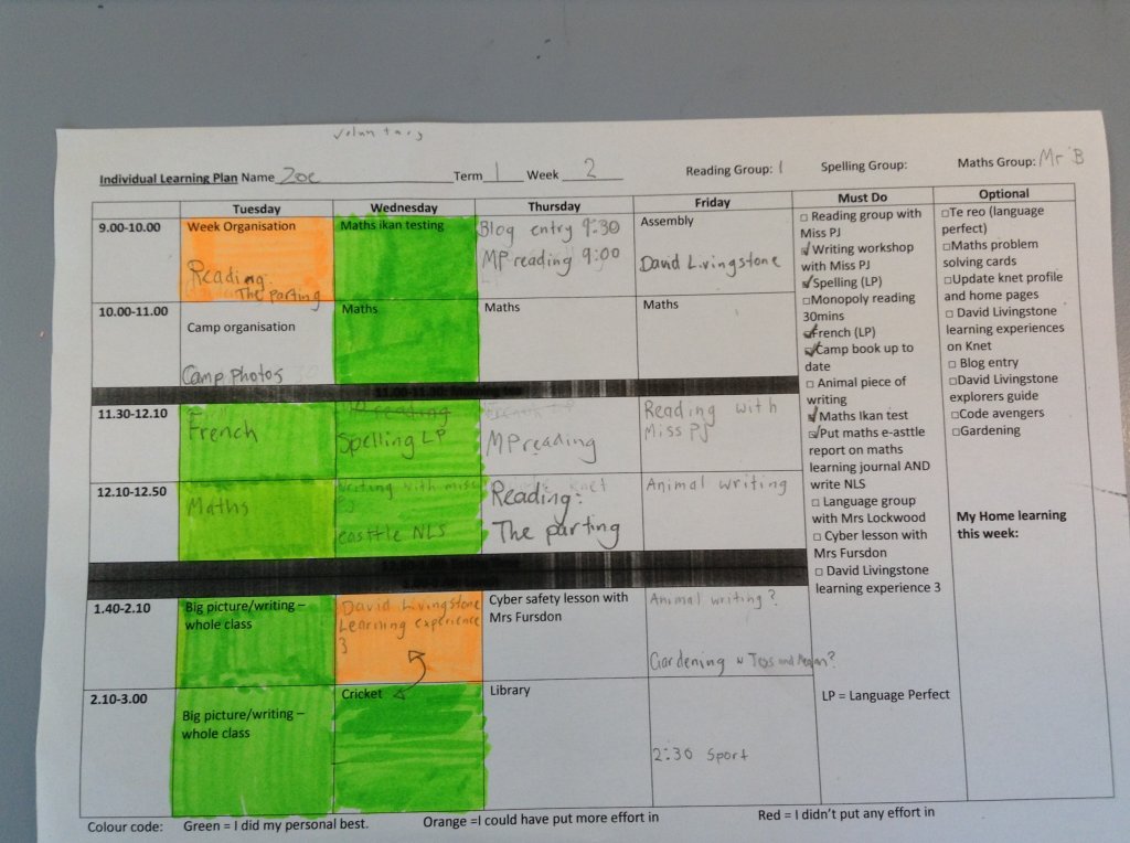 The ILP consists of three different components. First comes the teacher planning. Next is a timetable of the weekly workshops made on google docs. This is put up on the classroom wall and made available on the class page on KnowledgeNet. Here is an example: http://goo.gl/kwImX9