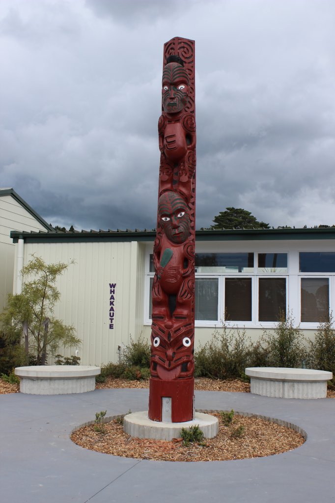 The much anticipated arrival of Te Pou at Konini School represented the culmination of two years of building relationships with iwi. The journey began with Ngatai Whatua before relationships with Kawerau o Maki were nurtured. Te Pou stands proudly at the school's entrance as the kaitiaki of the school community. This collaboration between school and iwi is the beginning of a journey that paves the way to developing strong learning relationships between school, whānau and community that will enrich the learning and inspire the learners. This lateral approach to learning sees a move from home school partnership to a more authentic collaborative approach, extending beyond the home and into the wider community.