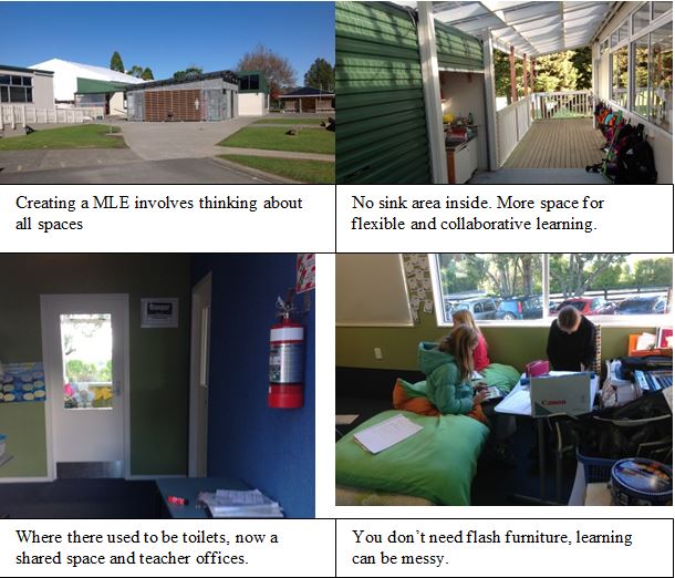 A challenge for most schools is developing optimal learning spaces from existing classroom space. For Taupaki this involved a slight increase in our floor plan footprint, which then had to be approved by the MLE panel so that we could access the appropriate funds. We had some very old prefabs which required modernisation. A designated teacher group had decided a few years ago to refurbish the toilet areas and make these into teacher spaces. By taking teachers’ desks and gear out of the classrooms more space was created for flexible learning. Two classes chose to also move their wet areas out of the main learning space (see below) to give more indoor area.